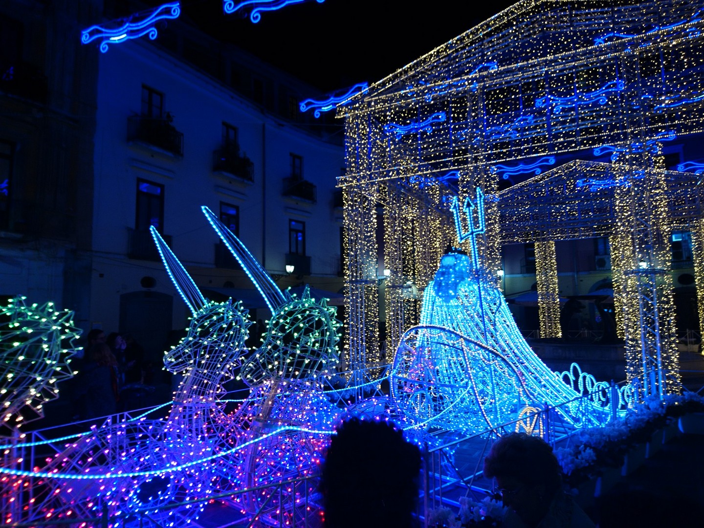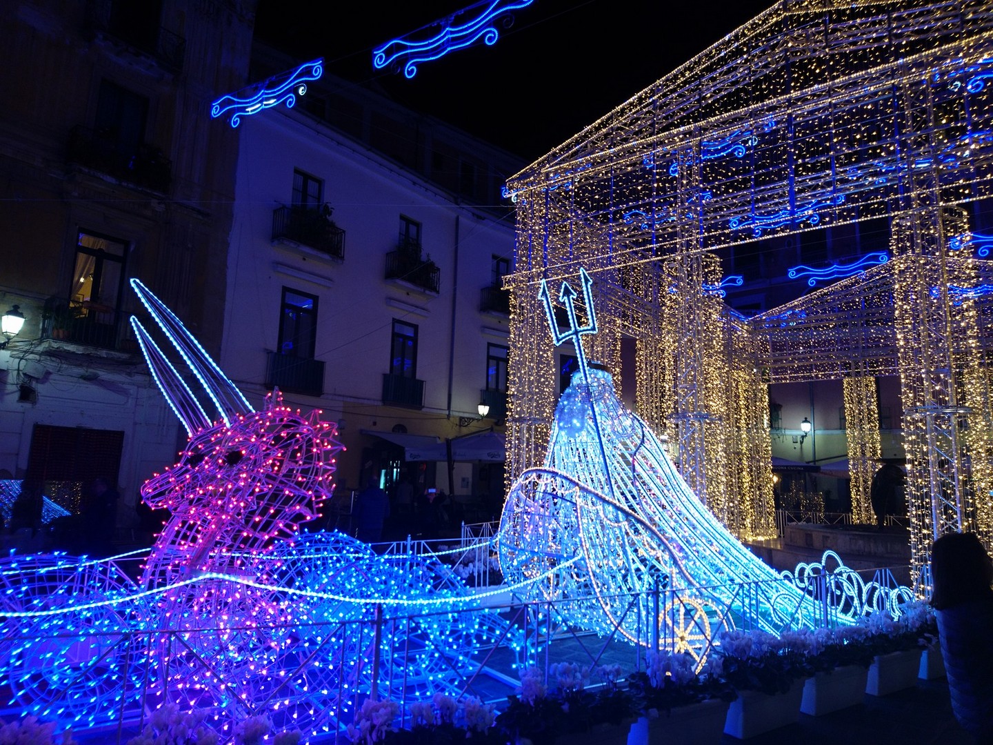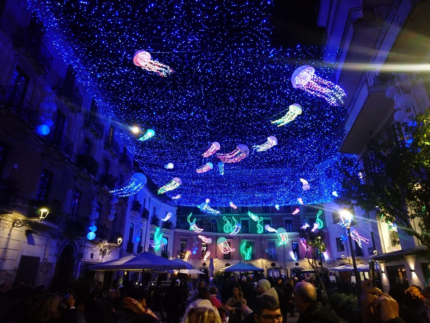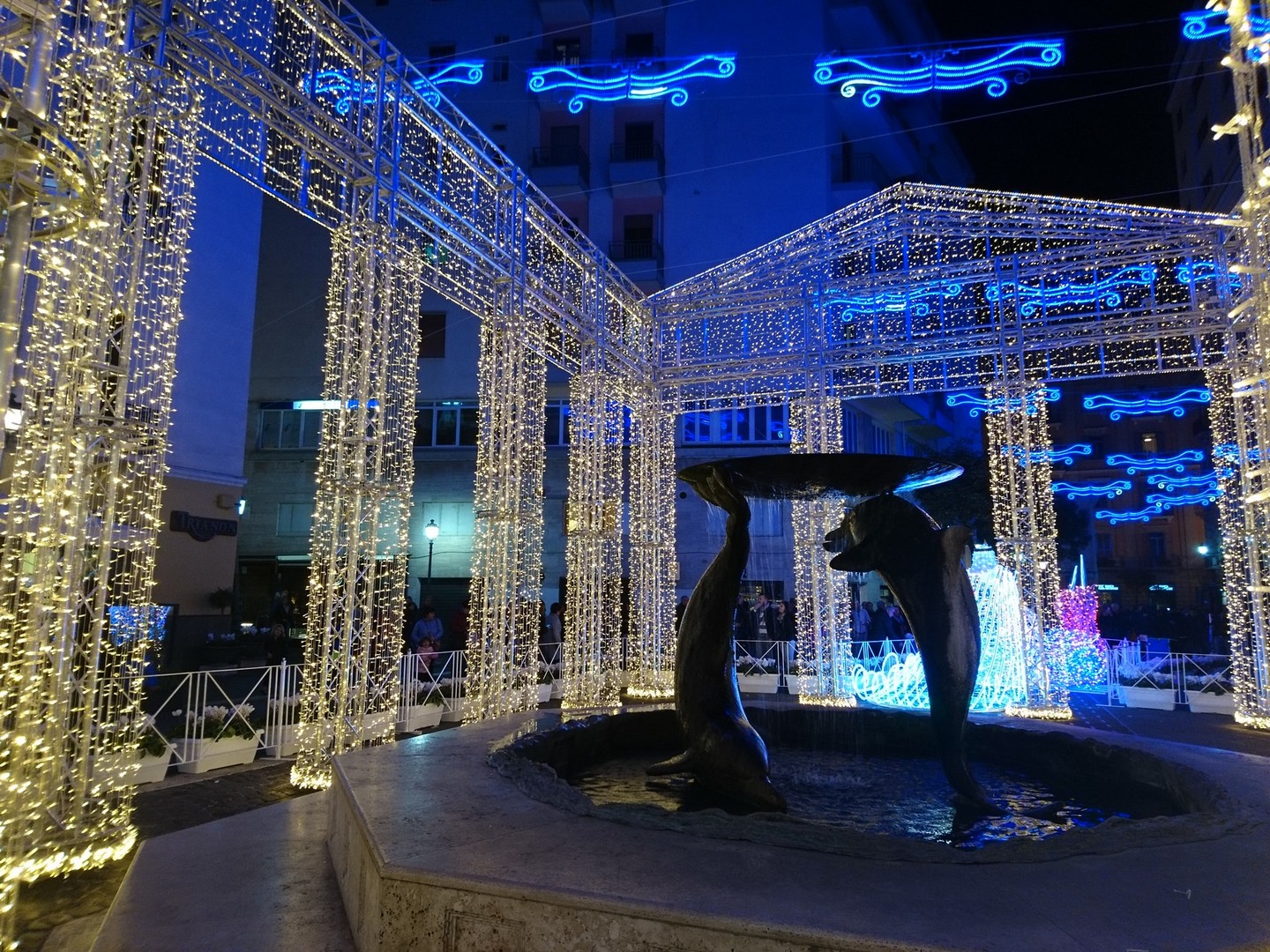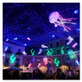 Potete passeggiare lungo le vie illuminate e ammirare le opere d'arte luminose tra gli edifici storici, le piazze della città, Lungomare, Corso Vittorio Emanuele e Villa Comunale.